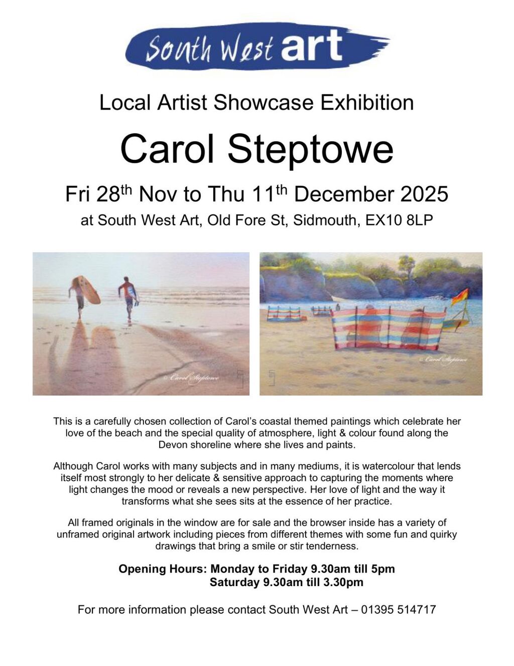 Exciting news....my window exhibition in Sidmouth starts tomorrow! It runs from 28 November – 11th December at South West Art, Old Fore Street, Sidmouth. The lovely team at South West Art have made this poster to share, do pop by if you’re nearby and enjoy some sunshine and colour in the window.